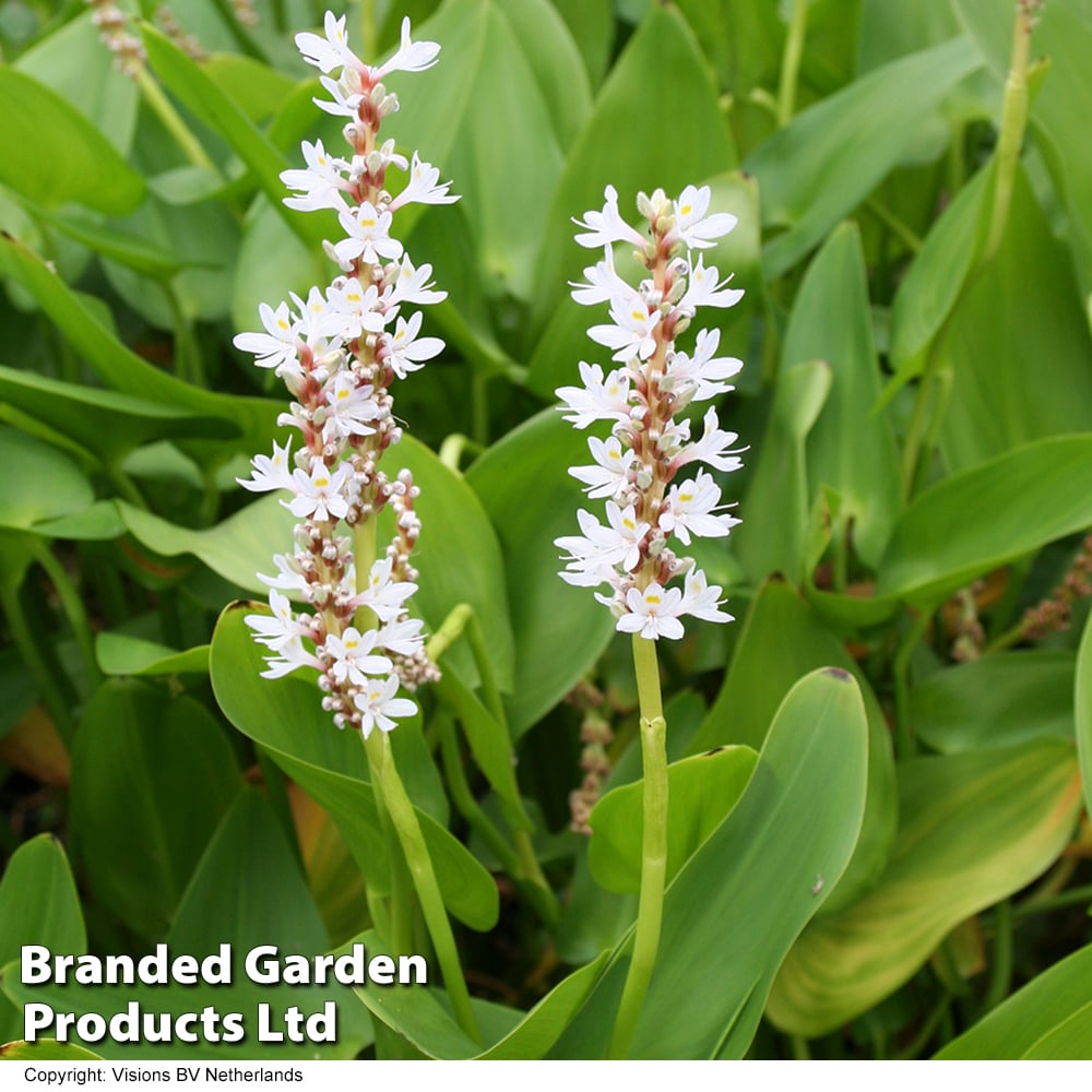 Pontederia cordata ‘Alba’ is an attractive white form of the common Pickerel Weed, with a shorter, more compact habit. The glossy, heart-shaped leaves form dense clumps of attractive foliage. Throughout summer, short, upright spikes of starry white flowers appear, standing out nicely against the backdrop of handsome, green leaves. This hardy perennial makes an excellent marginal aquatic for adding structure to pond planting schemes. Height: 70cm (27). Spread: 60cm (24). Planting depth: Zones 2 & 3 to 20cm (8) below water level.Plant height and spread is seasonal therefore we list by pot size rather than a defined plant size. The height and spread of the plant delivered will vary depending on the season, meaning arrival images are an indication only.