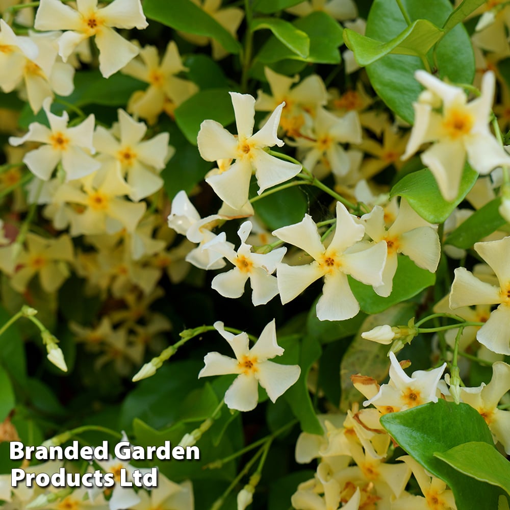 Star jasmine’s shiny, deep green foliage provides the ideal background for its spectacular blooms, which perfume the air with an alluring, pleasant smell. Trachelospermum ‘Star of Toscana’ looks great in a fragranced patio garden or against a sheltered wall for an absolutely luxurious exhibit. Throughout the summer, this graceful evergreen climber bears milky star-shaped flowers that grow to a soft yellow colour. Height: 9m (29?). Spread: 3m (9?).